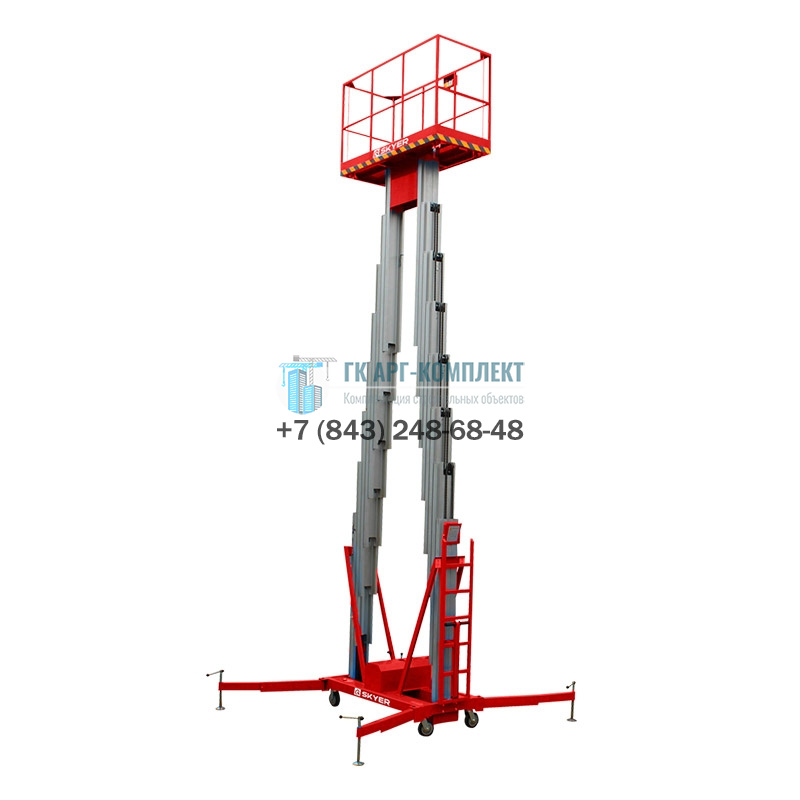Двухмачтовый телескопический подъемник SKYER GTWY10-200 — надежное устройство для подъема людей и грузов на высоту до 12 м для проведения монтажных, ремонтных и других работ. Оборудован специальной скобой для зацепа страховочного троса. Грузоподъемность модели составляет 200 кг, что достаточно для подъема двух рабочих и необходимого инвентаря. Выдвижные телескопические мачты из легкого прочного алюминиевого сплава обеспечивают плавный подъем рабочей платформы.