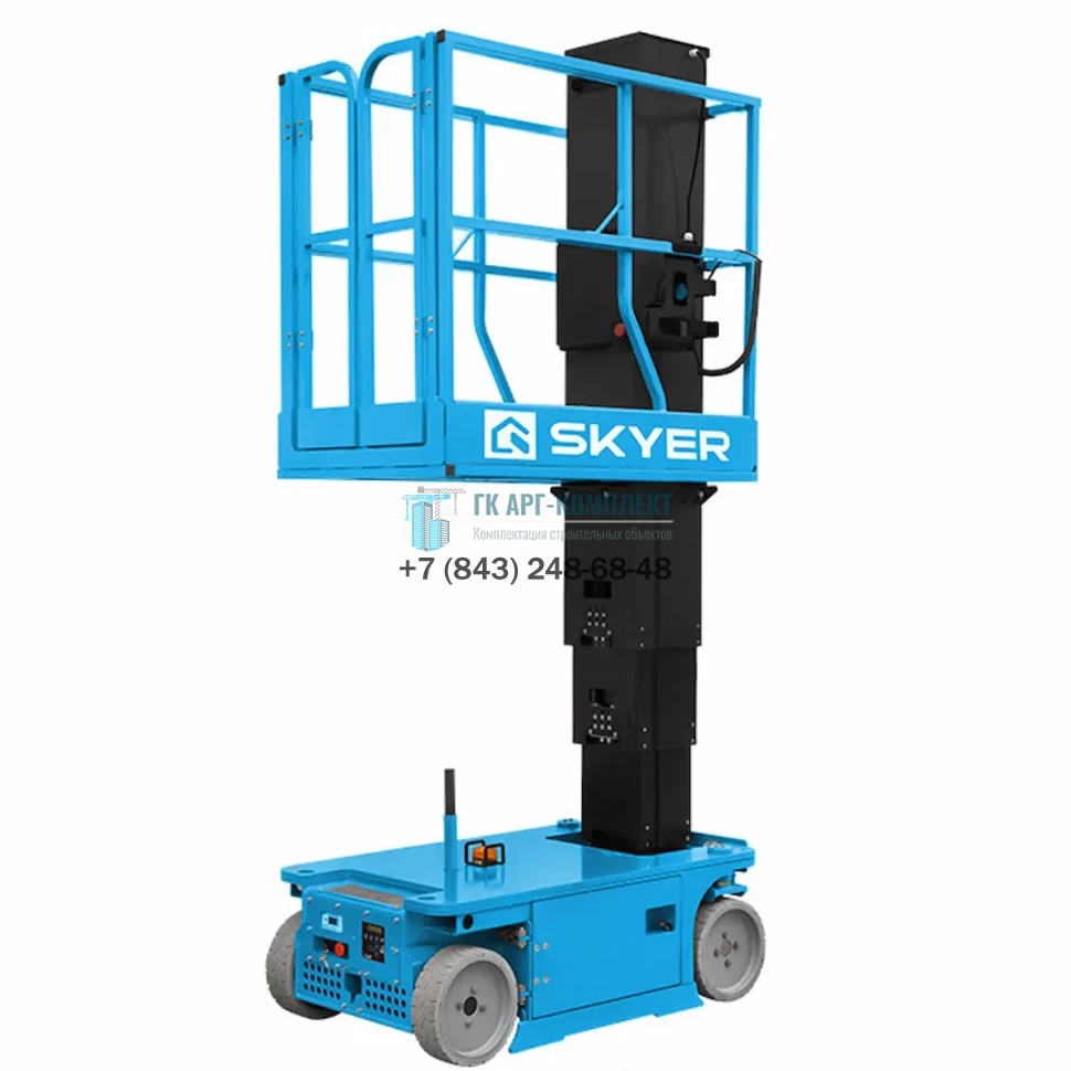 Вертикальный самоходный телескопический подъемник SKYER VM 0623 предназначен для подъема людей и грузов на высоту до 3.6 м. Оснащен электрическими двигателями мощностью 500 Вт (передвижения) и 2200 Вт (подъема). Емкие батареи позволяют оборудованию автономно работать целый рабочий день. Подъемник оснащен многофункциональным джойстиком и пропорциональным управлением, что увеличивает его маневренность. Малые габариты и вес позволяют работать в стесненных условиях и перемещать подъемник в грузовых лифтах. Рабочая высота подъемника составляет 5.6 м, грузоподъемность — 230 кг.