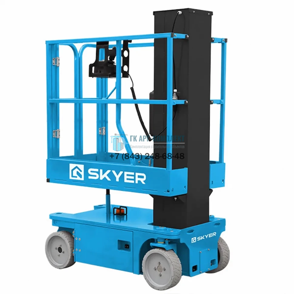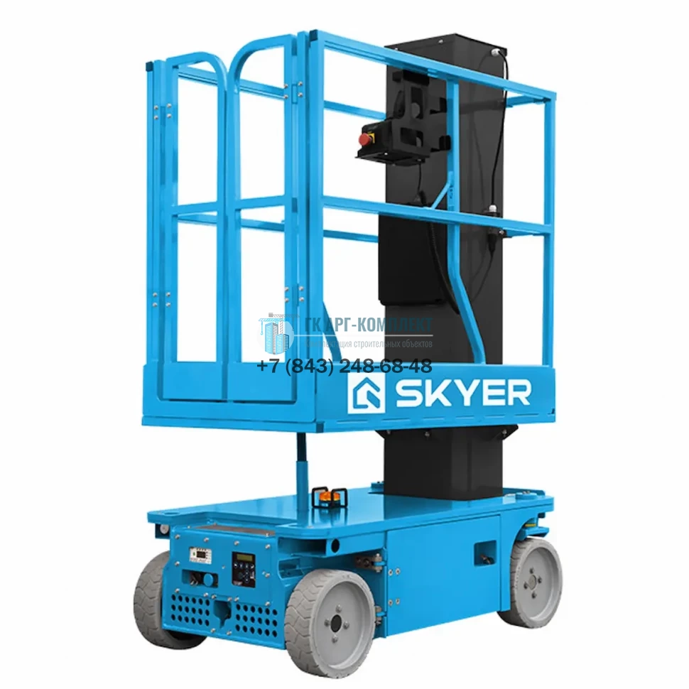 Вертикальный самоходный телескопический подъемник SKYER VM 0823 предназначен для подъема людей и грузов на высоту до 6 м. Оснащен электрическими двигателями мощностью 500 Вт (передвижения) и 2200 Вт (подъема). Емкие батареи позволяют оборудованию автономно работать целый рабочий день. Подъемник оснащен многофункциональным джойстиком и пропорциональным управлением, что увеличивает его маневренность. Малые габариты и вес позволяют работать в стесненных условиях и перемещать подъемник в грузовых лифтах. Рабочая высота подъемника составляет 8 м, грузоподъемность — 230 кг.